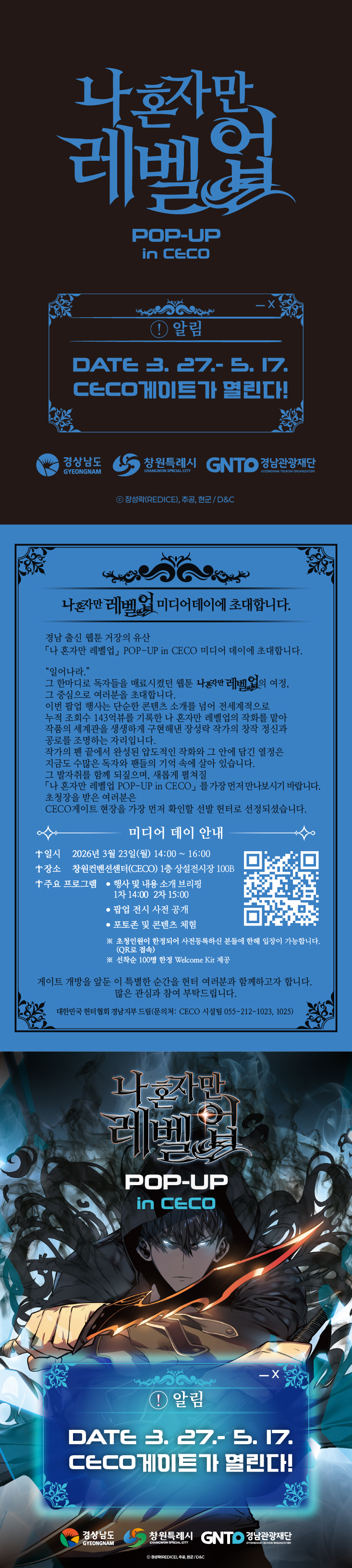 경상남도와 창원시경상남도관광재단은 오는 3월 27일부터 5월 17일까지 52일간 창원컨벤션센터(CECO) 1층 상설전시장에서 나 혼자만 레벨업 POP-UP in CECO’ 행사를 개최한다고 밝혔다이번 행사는 수도권이 아닌 지역에서 처음 열리는 팝업스토어다.