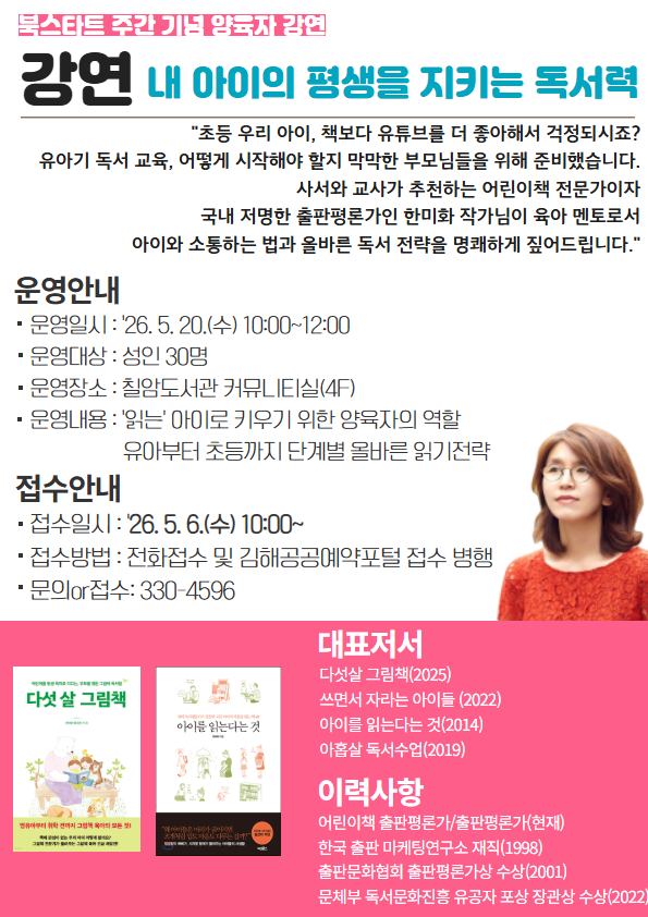 강연자는 육아 멘토이자 「다섯살 그림책」, 「아홉 살 독서수업」, 「아이를 읽는다는 것」등을 집필한 한미화 작가이다.