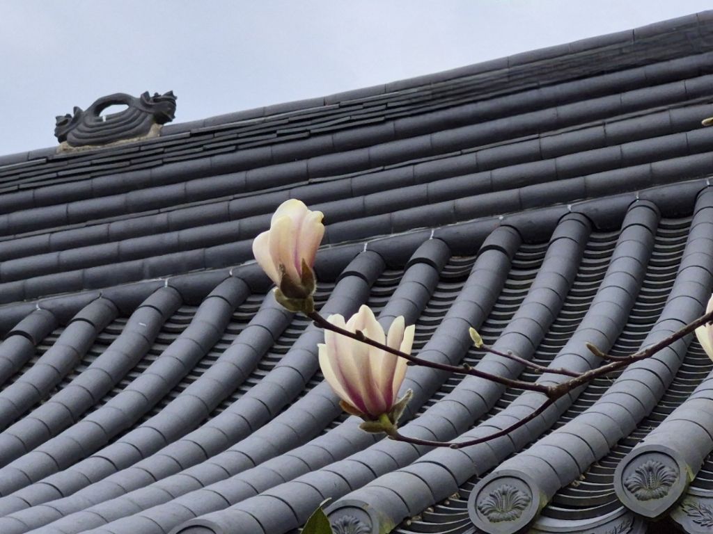 기와지붕 위로 가지를 뻗은 목련을 보며 봄의 시작을 디지털적인 감각으로 포착한 인상적인 작품입니다.