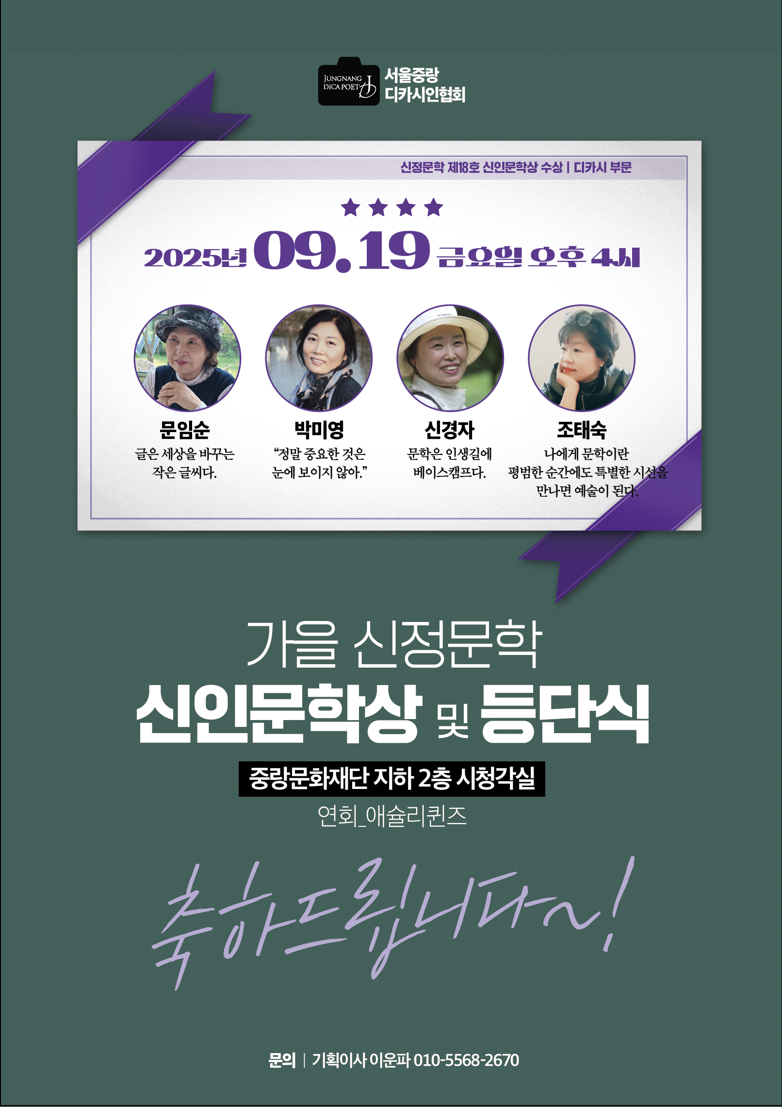 2025년 신정문학 신인문학상 디카시 부문 등단식 * 2025년 9월 19일 4시 중랑문화재단 지하 2층 시청각실