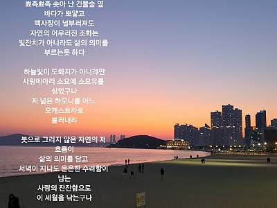 윤정화 시인 아름다운 사람 海珍 윤정화 마음이 이끄는 대로 끈을 묶듯 손이 가는대로 결을 느끼듯 아름다운 심장이 뛰는 소리 코드를 넣는다 고운 말은 하얀 빛이 되어 노을 진 색을 …