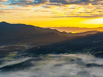 은편마을 아침 퍼포먼스 김 익 택 하늘의 손길에 땅의 입맞춤인가비단 이불 같은 뽀얀 안개가깊이 잠든 은편골을포근히 감싸고 있다