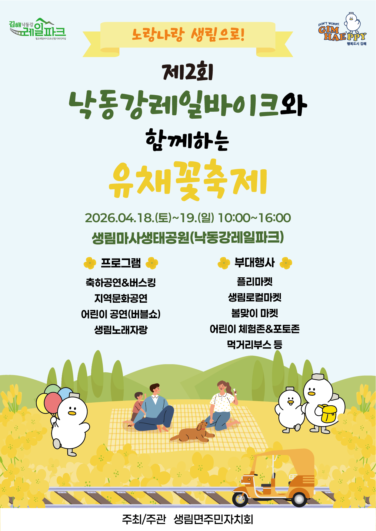 본격적인 봄 나들이철을 맞아 김해시 대표 관광지인 낙동강레일이크와 연계한 이번 축제는 노랑나랑 생림으로라는 슬로건을 주제로 노란빛으로 물든 아름다운 봄풍경과 함께 지역문화공연과 다채로운 체험 프로그렘이 준비돼 있다.
