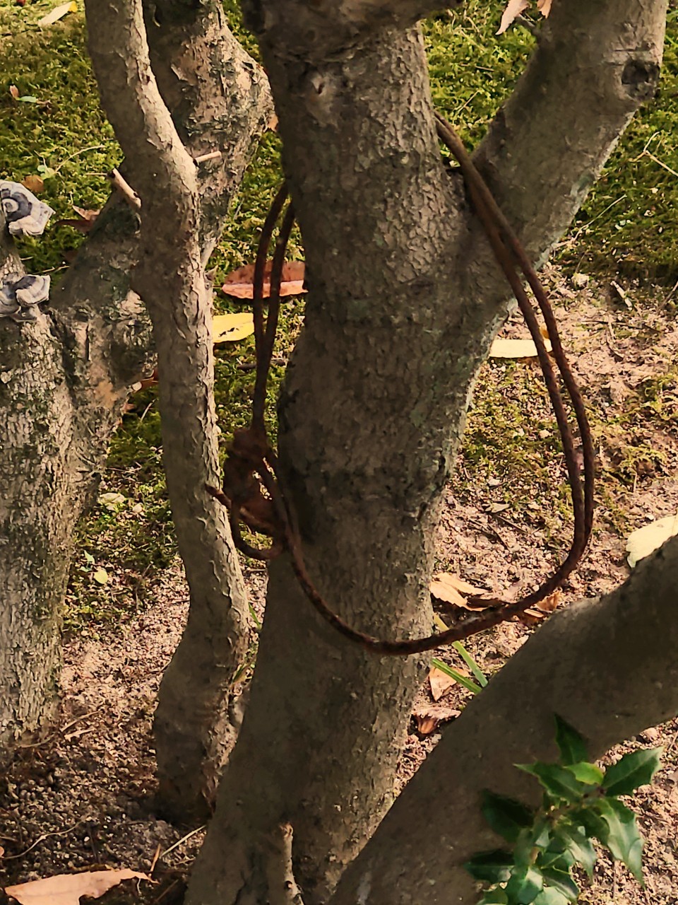 정원 나무 숲길을 거닐다 오래된 쇠줄이 줄기 사이에