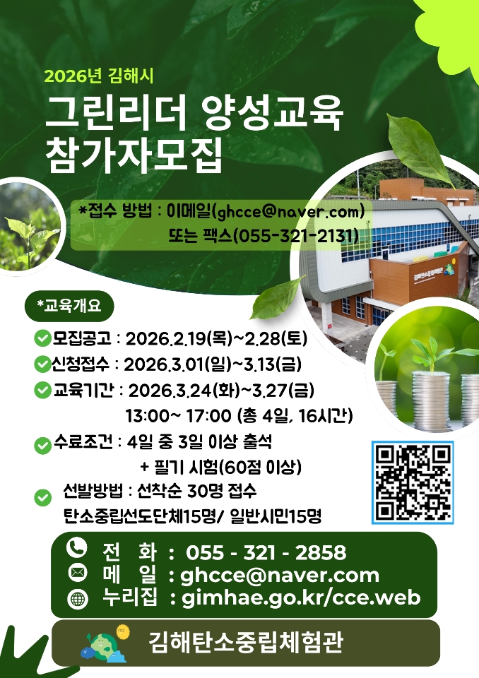 그린리더 양성교육은 김해시민을 대상으로 탄소중립 선도단체 15명과 일반시민 15명 등 총 30명을 선착순 모집해 3월 24일부터 27일까지 총 4일간 김해탄소중립체험관 교육장에서 교육을 진행한다.