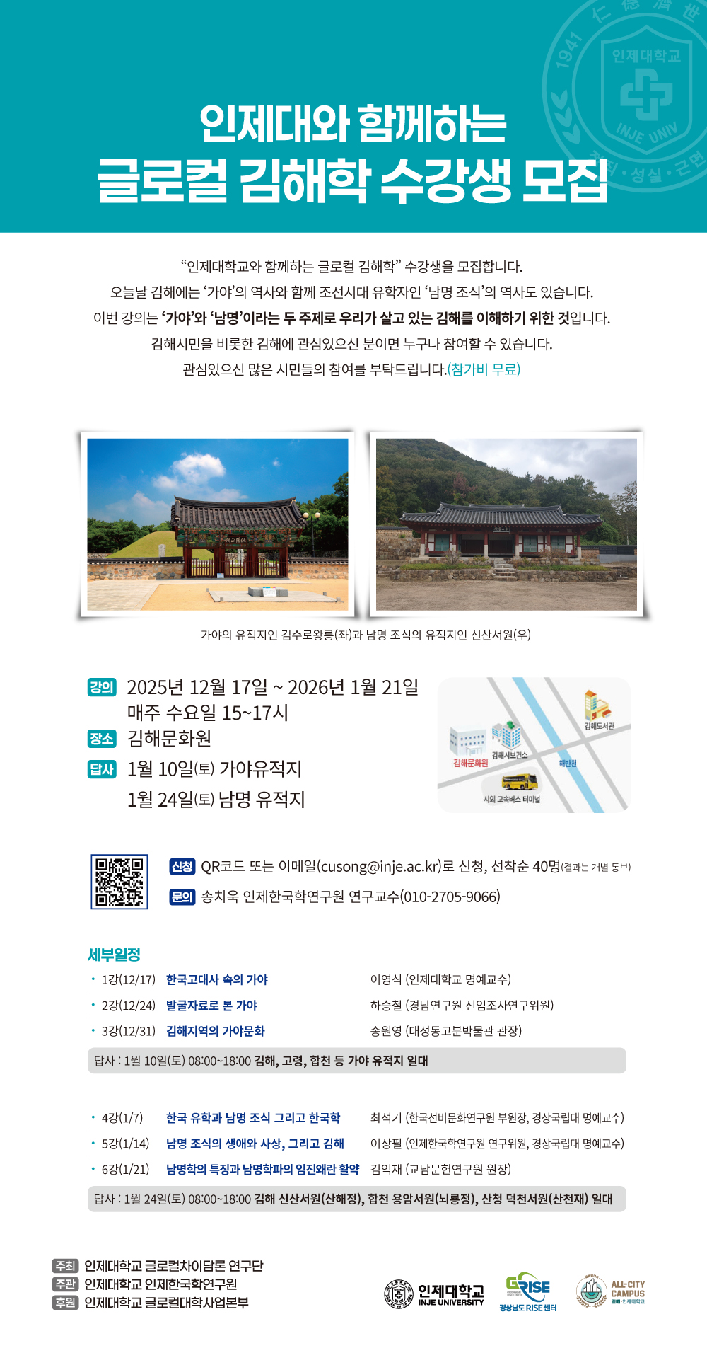 인제대학교(총장 전민현) 인제한국학연구원(원장 김언주)은 글로컬대학사업본부의 지원으로 지역학 기반 인문교양 프로그렘인 글로컬 김해학 강좌를 개설하고 수강생을 모집한다. 강좌는 1217일부터 총 8회 일정으로 진행되며, 강의 6, 현장 답사 2회로 구성된다.