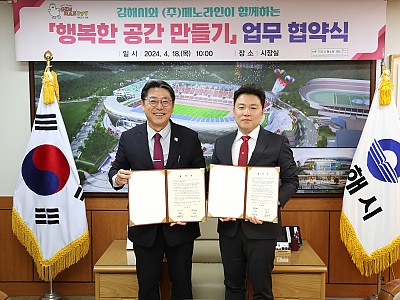 김해시와 ㈜제노라인이 함께하는 “행복한 공간 만들기” 업무 협약식 개최 김해시는 18일 시장실에서 ㈜제노라인(대표 김봉극)과 “행복한 공간 만들기” 사업 추진을 위한 협약식을 개최…