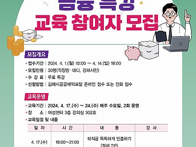 직장맘 역량강화 교육 직장맘『금융특강』참여자 모집 (재)김해시복지재단 직장맘지원센터는 4월 17일, 24일, 직장맘 역량 강화 금융특강을 개최한다고 밝혔다. 이번 강의는 BNK 경…