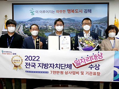 김해시, 전국지자체 일자리대상 ‘5번째’ 수상 영예- 위기 속 일궈낸 값진 성과…7천만원 상사업비 확보 - 김해시(시장 홍태용)는 ‘2022 전국 지방자치단체 일자리 대상’에서 우…