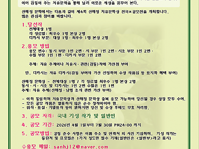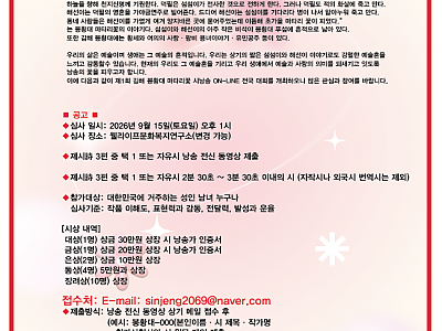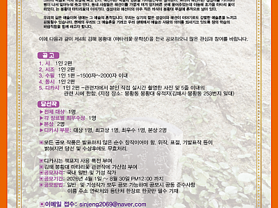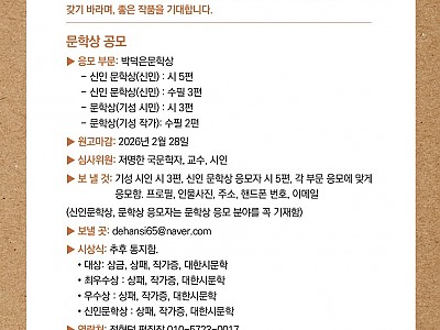 생명의 존중과 사랑의 문향으로 우리 문학 복지를 추구하는 <신정문학>이여러분의 소중한 작품을 다음과 같이 공모합니다.♤기간: 2026년 5월 01일 ~ 9월 30일 P…