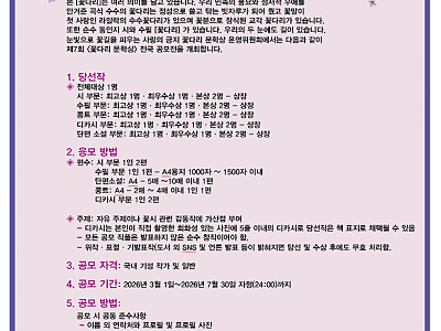 문화에술 동한행제7회 [꽃다리 문학상] 전국 공모 안내<취지 및 목표>본 [꽃다리]는 여러 의미를 담고 있습니다 .우리 민족의 풍요와 정서적 우애를 안겨준 곡식 수수의 …
