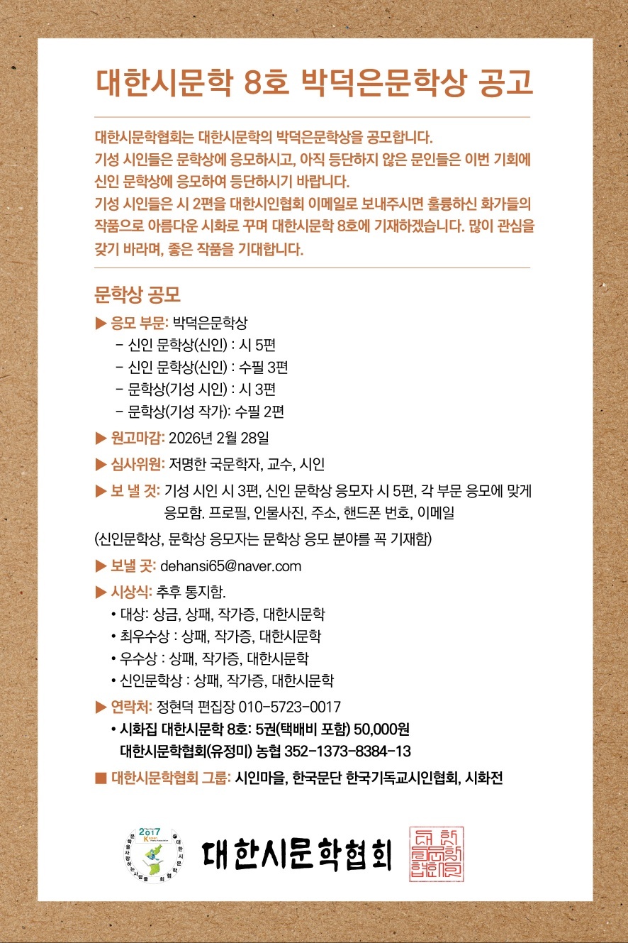2026년 대한시문학 8호 박덕은 문학상 공고