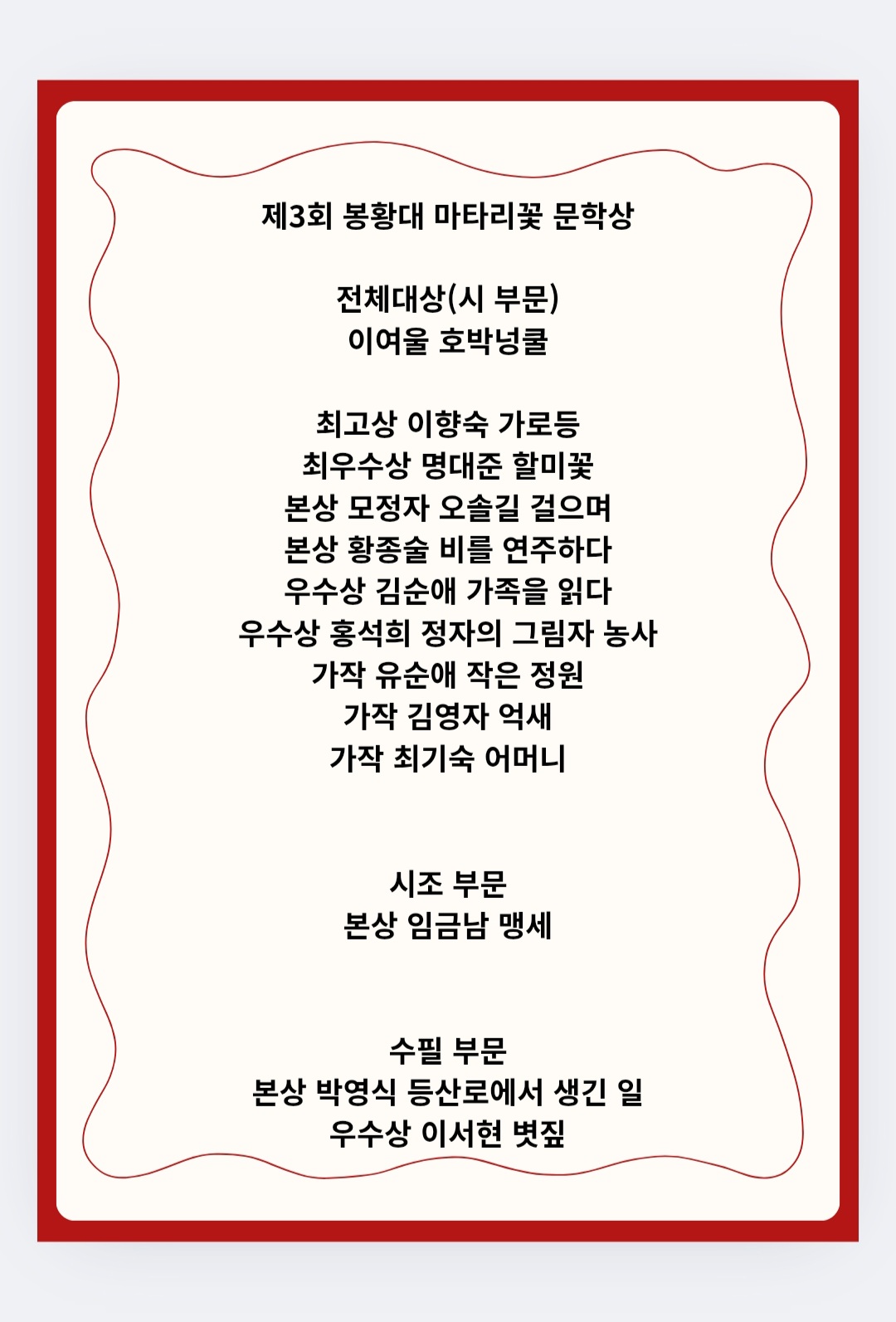 2025년 제3회 봉황대 마타리꽃 문학상 및 왕비 용녀 문학상 당선작