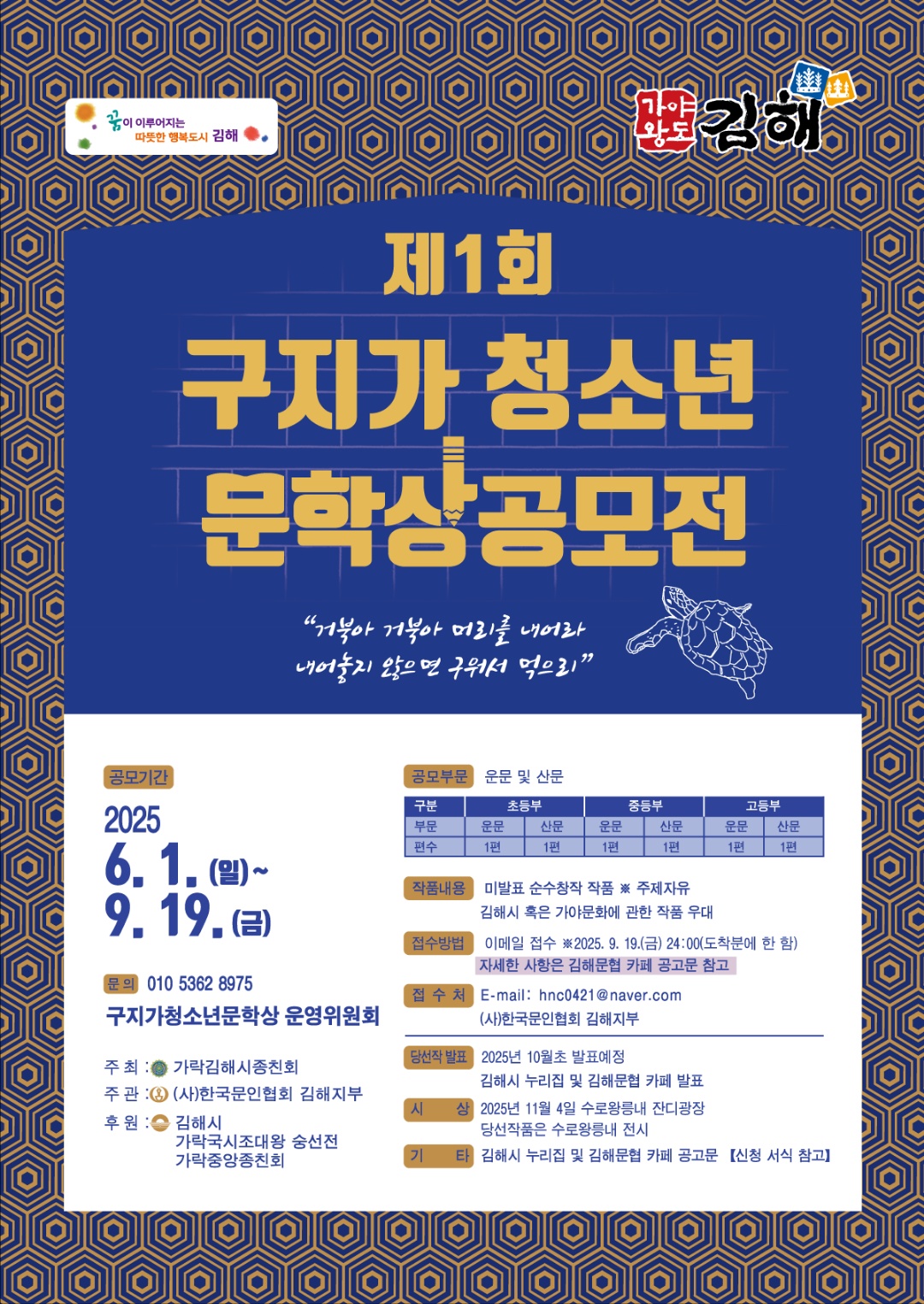 문의는 구지가청소년문학상 운영위원회(☎ 010-5362-8975)로 하면 된다.이번 공모전은 김해시와 가락국시조대왕 숭선전, 가락중앙종친회가 후원한다.운영위는 “전국 청소년들이 김해의 역사와 문화를 배경으로 한 창작 활동에 참여해, 가야문화의 가치와 의미를 재발견하는 계기가 되길 바란다”고 전했다.