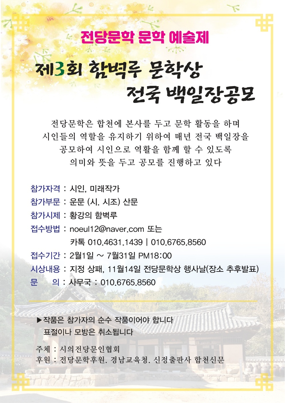 2026년 전당문학문학예술제 * 제3회 함벽루 문학상 & 제2회 헌산 시조 문학상 전국 공모